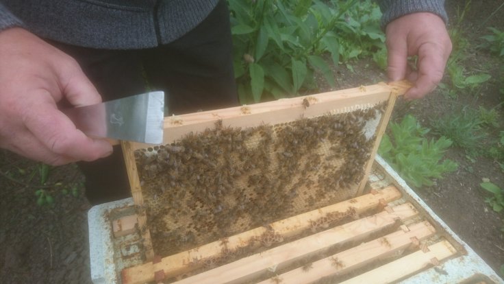 So armed only with a thin fleece, I helped Steve check the new hive. The yellow contaiowhich held the Queen bee was still stuck between two of the frames. Steve managed to retrieve it using the hive tool to prise it out.