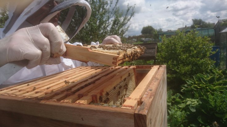 Phil and I topped up the smoker and started checking the big hive on Phil’s plot. It was so busy! We removed the supers, which are groaning with honey. We reorganised the frames so that all the capped ones are in one super, ready to collect the honey in a couple of weeks.
