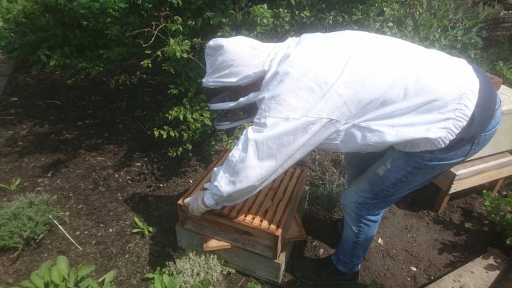 Next I spotted Steve and Phil and joined them in checking the bees. We started with the hive on the Community Garden. It took a while but we eventually found the Queen hiding on one of the brood frames at the back of the brood box.