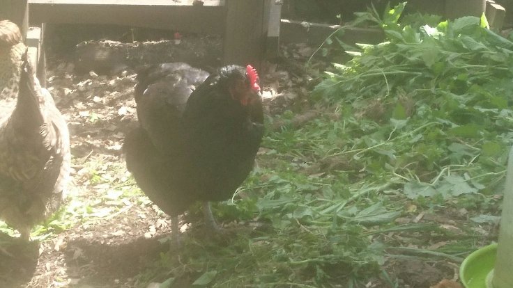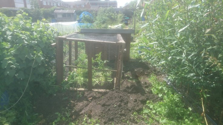 I wandered across to Rachael’s plot to have a check of the coop. As I was clearing the weeds away from one side, Geoff appeared armed with some tools and batons of wood. Geoff has come up with a great plan to join the run to the nest box and put in fox deterrent fencing around the Base of the coop. I managed to clear one whole side of weeds and lugged an enormous armful to the main coop. In their enthusiasm, I nearly trod on several of the chickens but the massive pile of weeds should keep them occupied for a while!