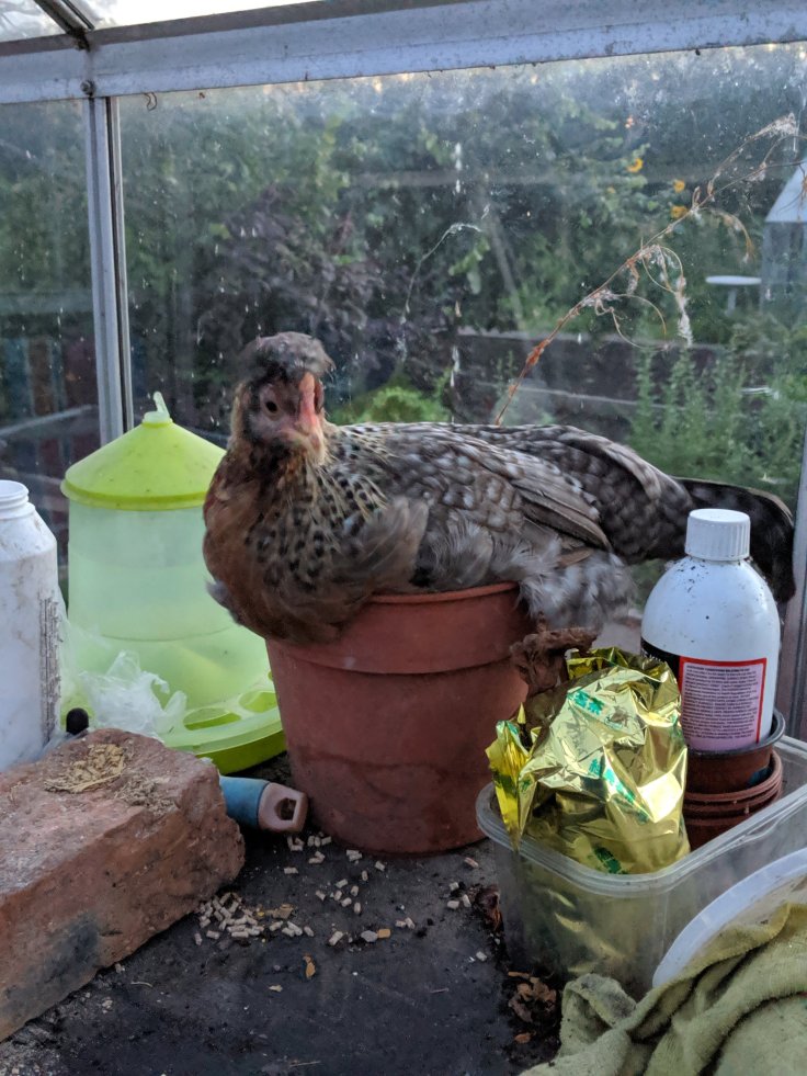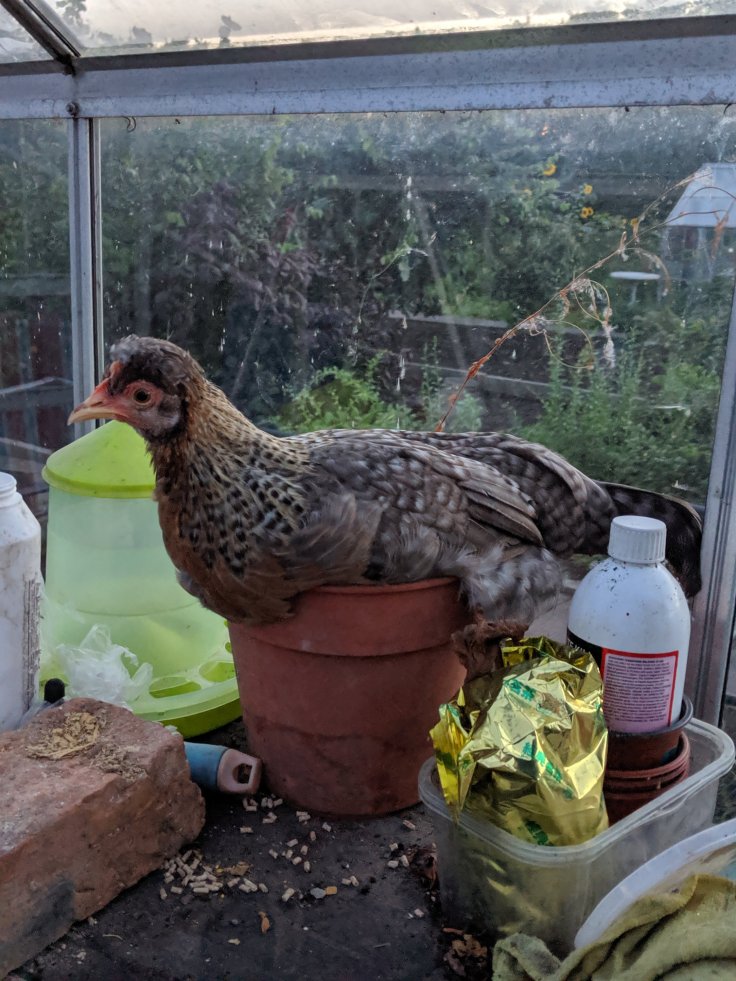 This evening my husband and I went down to the allotment to check on the chicks in the greenhouse. We found them both in the nest box together although the cream legbar looked a bit uncertain about being so close to Leia. She wandered about as I refilled the water bowl and picked up the pieces of a smashed mug someone had managed to knock off the table. As I put the refreshed water bowl back into the greenhouse, I startled her and she flew up onto the top of the table. Clearly, she feels safer up there so I sprinkled a small handful of grower’s pellets into a large plant pot so she has a snack up there with her. Oblivious to this, she then promptly roosted in the plant pot.