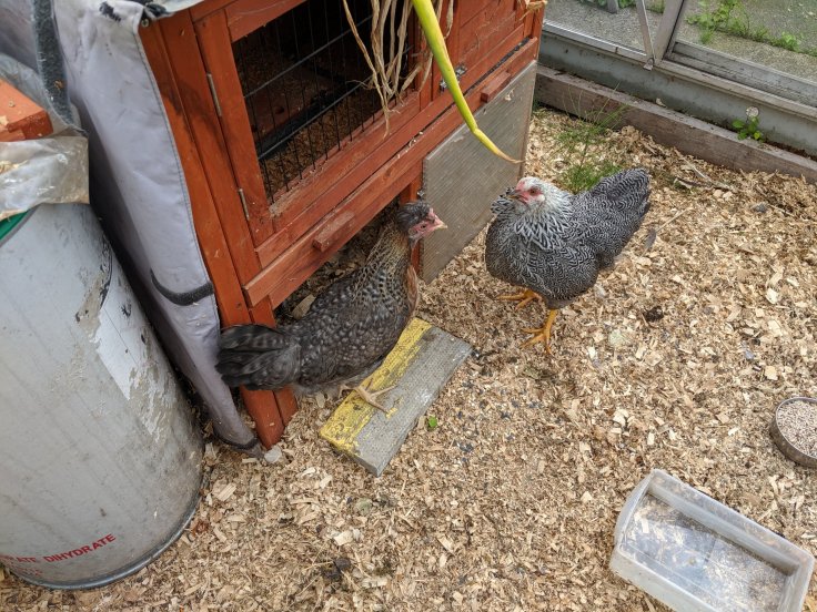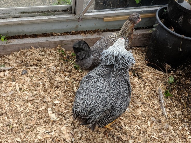 Over the next hour, Leia kept squaring up to the other chick but eventually lost interest, taking a dust bath. The cream legbar walked around the greenhouse, scratching at the sawdust and having a long drink. Phil dropped by to see how they were doing and suggested leaving them together overnight as they seemed to be settling down. Part of the reason why Leia had been so aggressive at the start may have been because she has been on her own for 3-4 weeks and has become quite territorial. As I left, they were ignoring each other which is progress. Hopefully they will hit it off overnight so that both of them can have a friend.