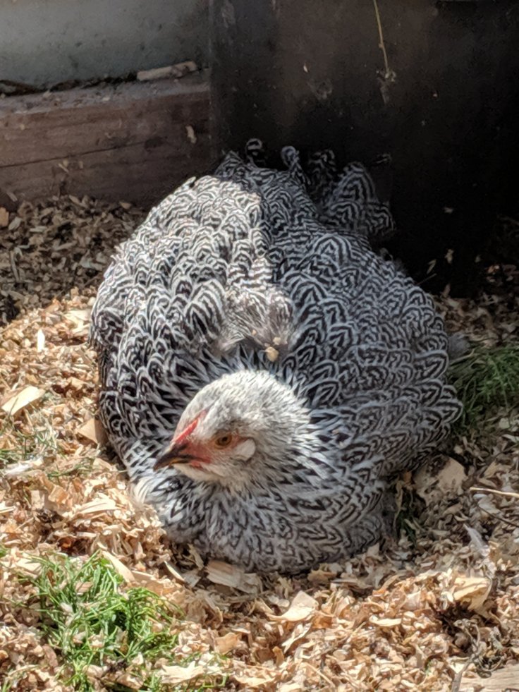 I moved the coop outside onto the patio area and tidied up the inside of the greenhouse. I reorganised the bigger bits (ladder, storage container, stool) and took out the pet carriers so the floor was clear. Then I walked to the broody box to collect our Plymouth Rock chick. She was easy to catch but rather unimpressed with being held. I carefully put her into the greenhouse and placated her with a handful of oats and sunflower seeds.