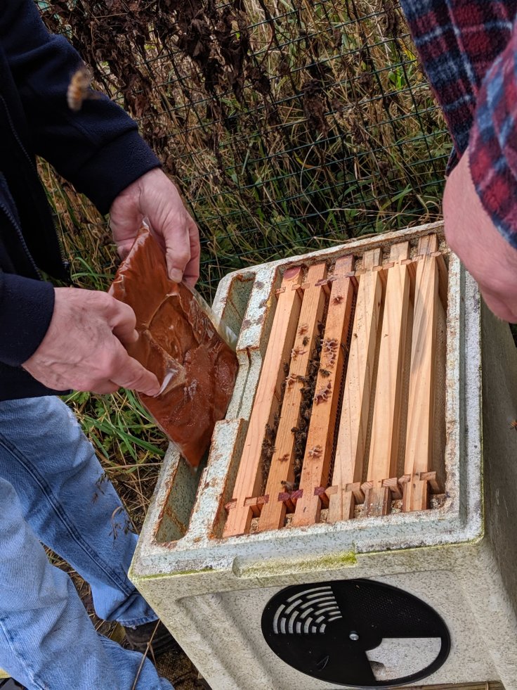 Steve and Phil checked the bees briefly today and they all seem to be doing well. Phil added a fondant icing pack to one of the hives to feed them. The other hives will be fed with a sugar syrup for the next couple of weeks to help the colonies build up their honey stores for winter. As the temperature drops, they will go out less and less and rely entirely on their honey stores within the hive.