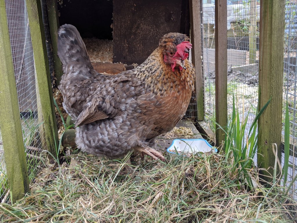 Despite the rain, we walked down to the allotment this morning wondering if Dolly was any better. It is notoriously difficult to know whether a chicken is going to pull through or not, sometimes you are convinced they will never make it (e.g. Leia and hypothermia) and others who seem to only have minor issues die. Upon arrival at the main coop, Dolly was sitting with Polly on top of the food bins. I haven’t seen her up there in a few days.