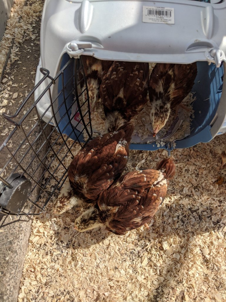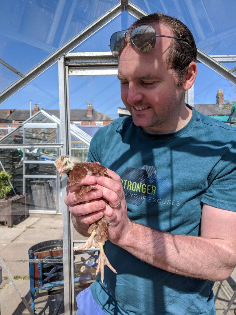 We had a slow start today and decided to pop down to the allotment at lunchtime. Just before we left, I popped in to check on the chicks. To my horror, I found a chick on top of the netting we had put on the top of their coop to stop them getting out. I could also hear panicked cheeping coming from underneath it. I yelled to my husband and between us we got the offending bird back into the enclosure whilst repeatedly counting the chicks to make sure no one else had escaped! Clearly their enclosure is far too small to contain them anymore. Leaving my husband to make sure they didn’t escape again, I grabbed the pet carrier and prepared it. This was it. To the allotment they must go!