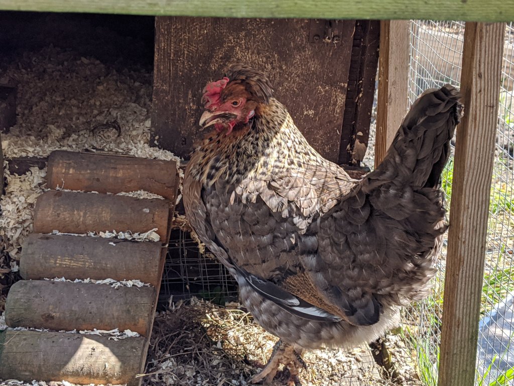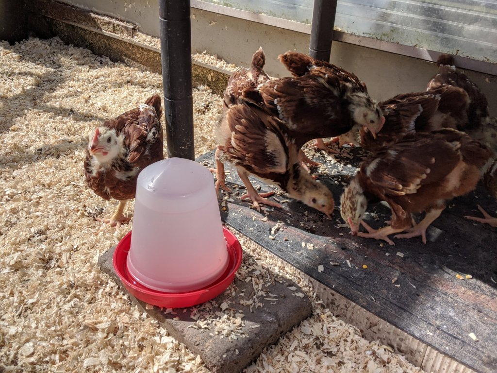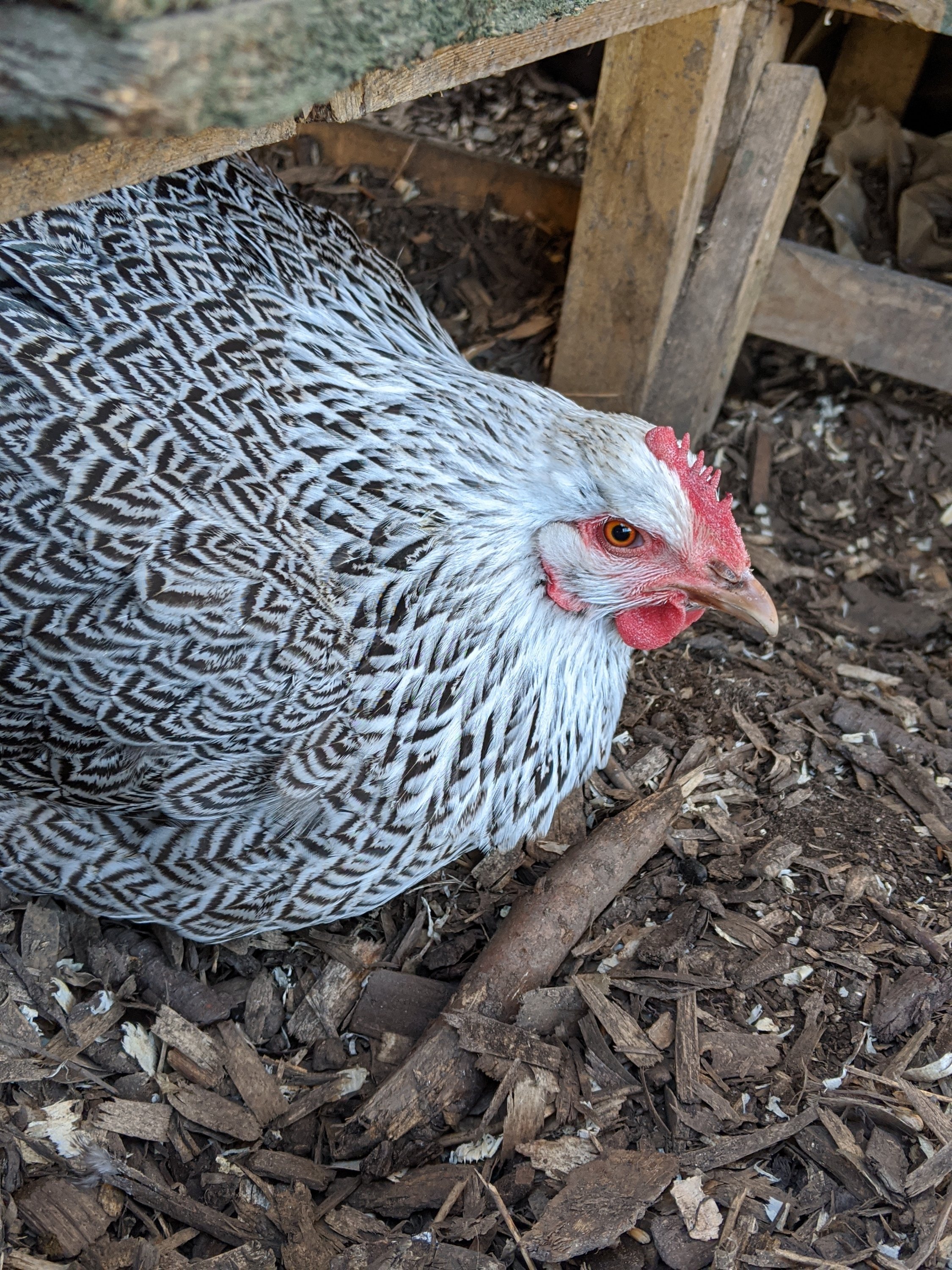 Before we left, we discovered Leia cowering under the nest box in the main coop. Determined to protect her, we moved her up onto the top of the nest box and gave her some treats. She has never been in with so many chickens and she clearly has no idea what is going on. As we left, she was sitting disgruntled on the top, glaring at us. We will pop down later to check on how WWIII is going!