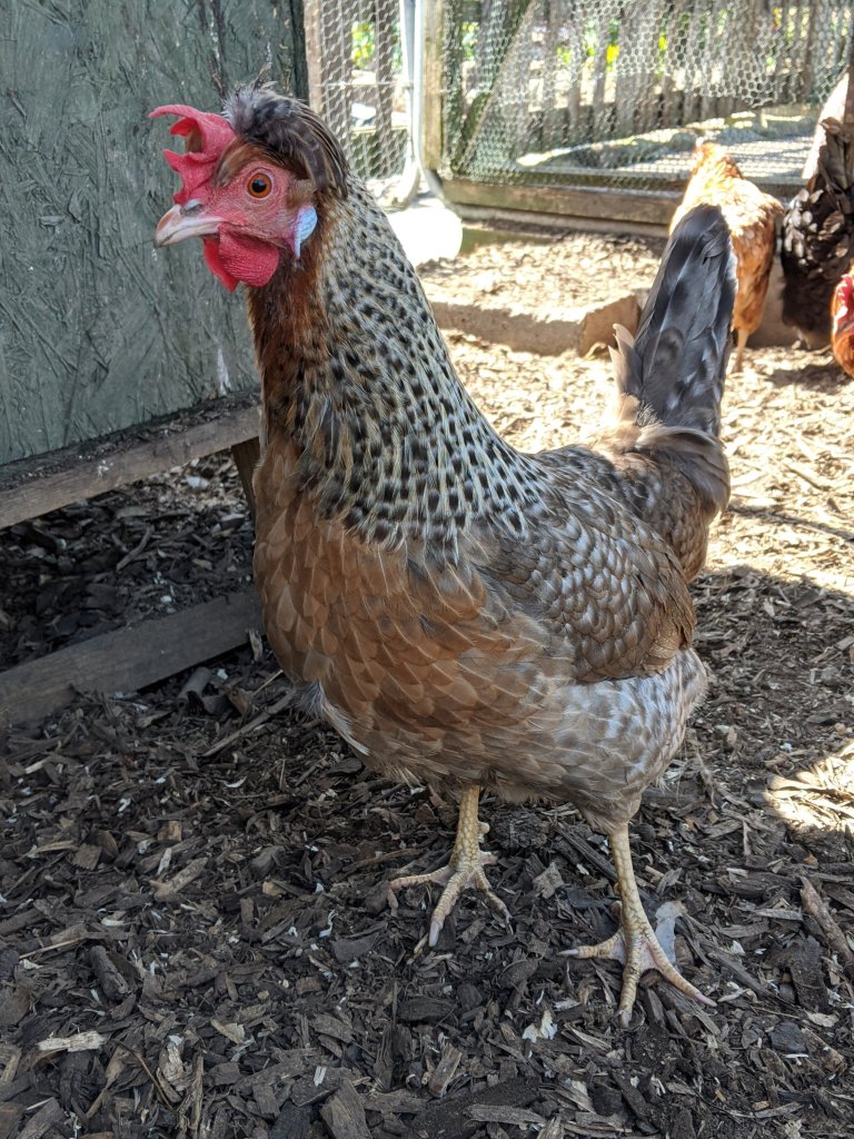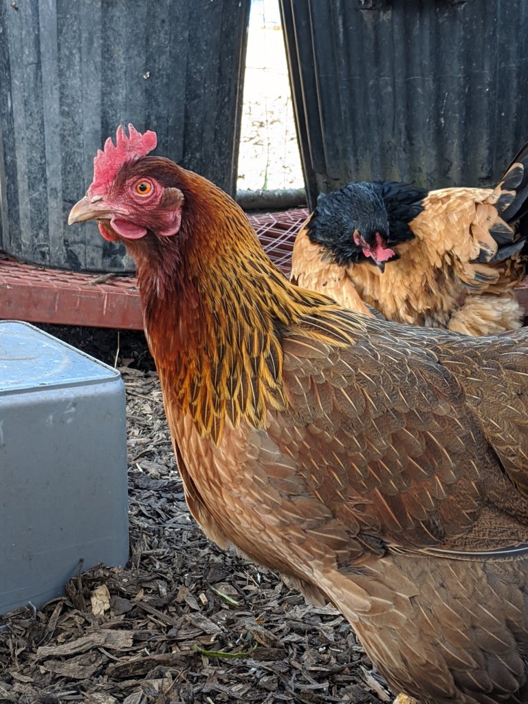 Next we fed the girls in the main coop. They were busy scratching and we managed to collect two eggs. Still a poor showing from eight birds, but still better than the last few months where we have had nothing! It took several minutes to get hold of Rey and Leia – Leia in particular was very unimpressed with being held – and we walked them down to the main coop. In order to give them some space, we placed them on the top of the nest box with their food and water bowl. It’s important when trying to integrate new birds that you have multiple food and water containers so that the new birds can still feed. We stood in there for half an hour and there were some scuffles. Millie especially has taken extreme offense to Leia, another gorgeous and massive chicken. Rey seemed to get off lightly but that may be due to her small size and speed. Most of our flock are quite elderly and are no longer as nimble as they used to be.