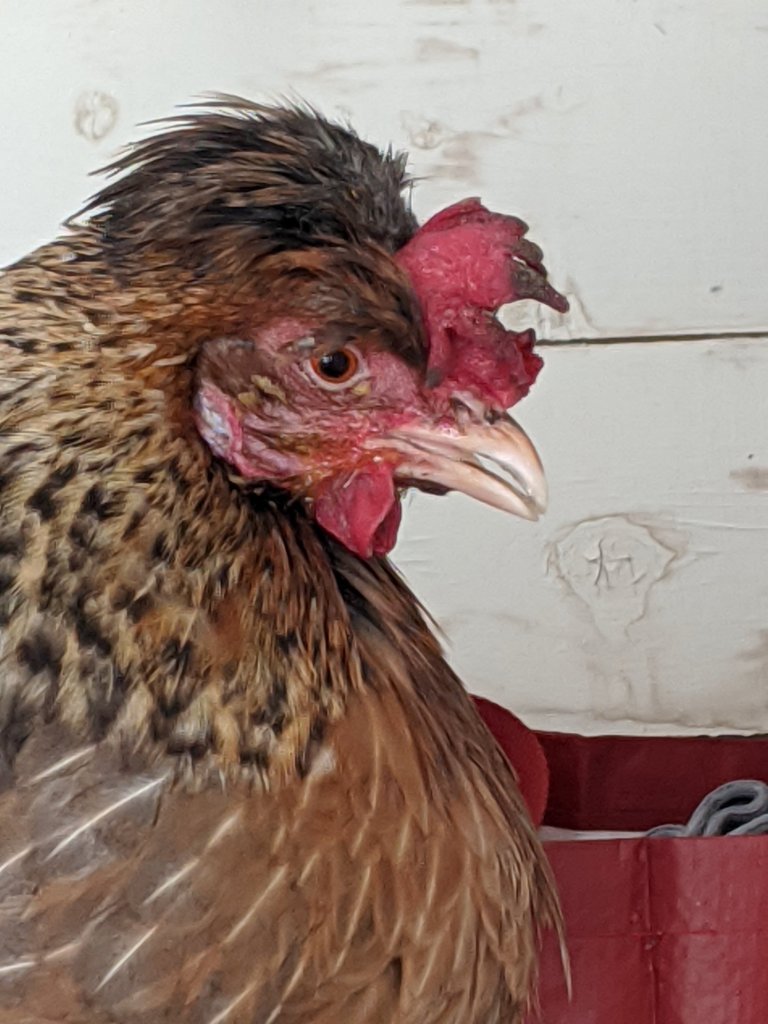 Dolly seemed a little more with it today and we took her up to the shed to feed her. We let her roam in the shed for a bit while we watched her. I reminded her that under no circumstances was she to make a mess in the shed. She took one look at me, aimed her rear end and proceeded to poo all over the cover of the wormery. Part of me was insulted, the other part, rather impressed. In checking on Dolly these past couple of weeks, the nest box and coop hasn’t had any poo in it due to her liquid diet. However, today’s waste shows she must be managing to eat a little solid food. With my husband holding her, I managed to get quite a lot of gunk out of her beak. Cliff reckons she has broken it, and I have to say I think I agree. It doesn’t feel particularly stable when I am scraping it out. She tolerated the scrape out quite well considering it must be uncomfortable. We let her have a quick rest before syringe feeding her. We managed to get four syringes of egg yolk down her, more than we have in a couple of days and lots of water. After feeding her, we put her back into her coop, placed the remaining egg down in a small pot and left her to chill out.