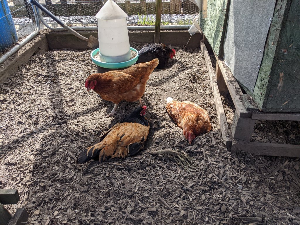 The main coop definitely seemed quite empty with Dolly in her isolation coop and Katie missing. Most of the girls were busy enjoying the sunshine or rolling in a freshly dug hole. I tried to collect the eggs only to find Pop and Polly sitting inside looking like they were about to lay. I left them to it and cleaned out the nest box while my husband sorted out fresh water for them.