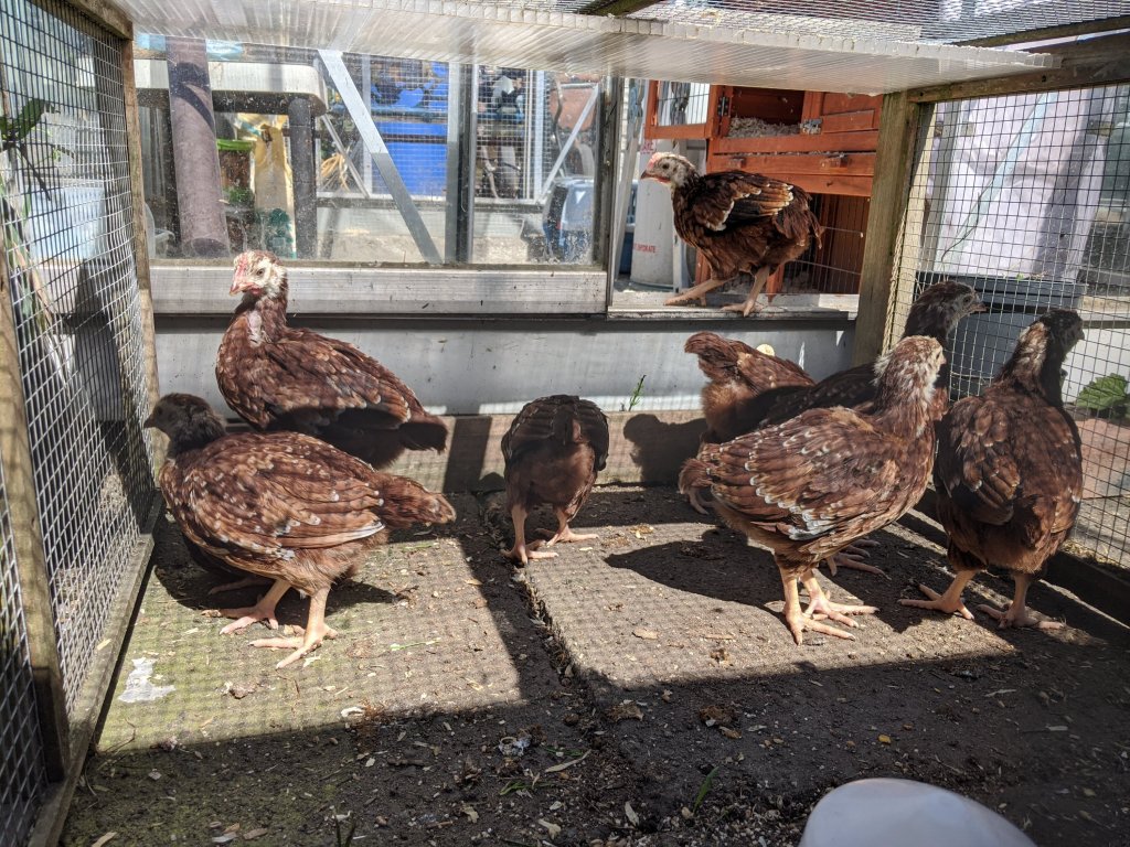 As they are now too big to go into the pet carrier, we put them into the mini outdoor run. Today was their first time outside and it probably wasn’t the best day as there was a significant wind. But they seemed happy enough for half an hour while we cleared out the greenhouse. We refilled their water and food after putting down new shavings. There is a school of thought that says chicks shouldn’t be on shavings because they are a choke hazard. In our experience, albeit limited experience, they manage fine with it. Instead of handling them to get them all back it, I decided to see whether they could work out how to get back in by themselves. I slid open the backdoor of the greenhouse and waited. It was only a couple of minutes before one saw it’s chance and hopped up onto the threshold and jumped down. Like sheep, the rest followed one or two at a time until they were all back inside.