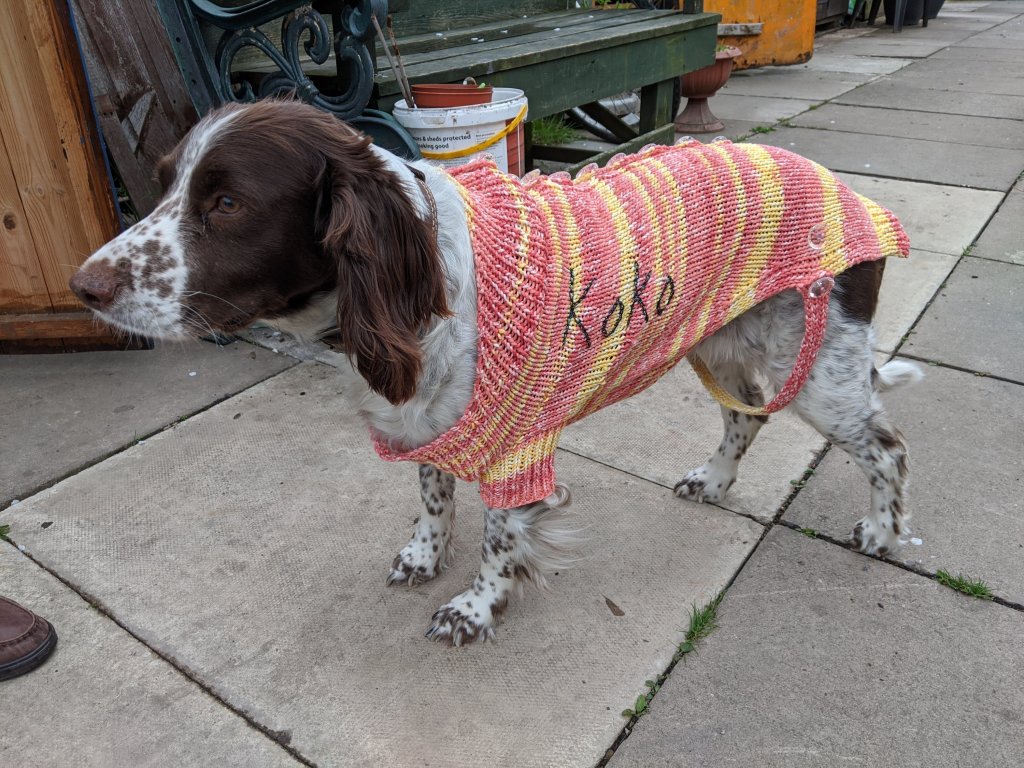 I found him at the bottom of his plot and gave him the parcel. Out came a stunning hand knitted dog jumper embroidered with Koko’s name on the side. It was a beautiful mix of yellows, oranges and pinks in a beautiful pattern. We decided that Koko should have a fitting straight away. She was less enthused about the entire scenario and sulked the whole way through it, making sure to be as difficult as possible at every stage.