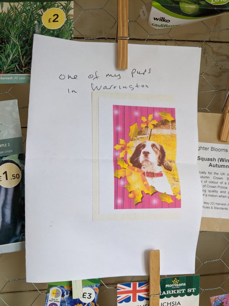 Yesterday, Cliff dropped into the shed a beautiful card to say thank you for Koko’s jumper. It has a beautiful photo of one of Cliff’s spaniel puppies he bred. I put it up in pride of place on my seed wall.