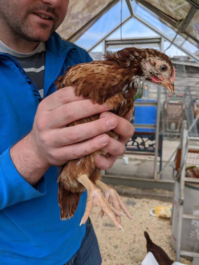 Next I walked up to the greenhouse and decided it was time to clean out the chicks. I opened the back door of the greenhouse and gently lifted the top of the run. One chick took the opportunity to jump up onto the top of the run and fly down into the greenhouse. The second one did the same before deciding to get itself stuck between the greenhouse and the run. That space is tiny and it was almost impossible to reach to grab the chick. Eventually, I managed to half grab it and dump it unceremoniously into the greenhouse. The split second I let it go, it came back and attempted to get back there. I kept chasing it away but it wouldn’t stop. Giving up, I closed the greenhouse door and turned my attention to the last chick who was anxiously cheeping in the run. After several frantic attempts, I caught it and put her into the greenhouse with the others.