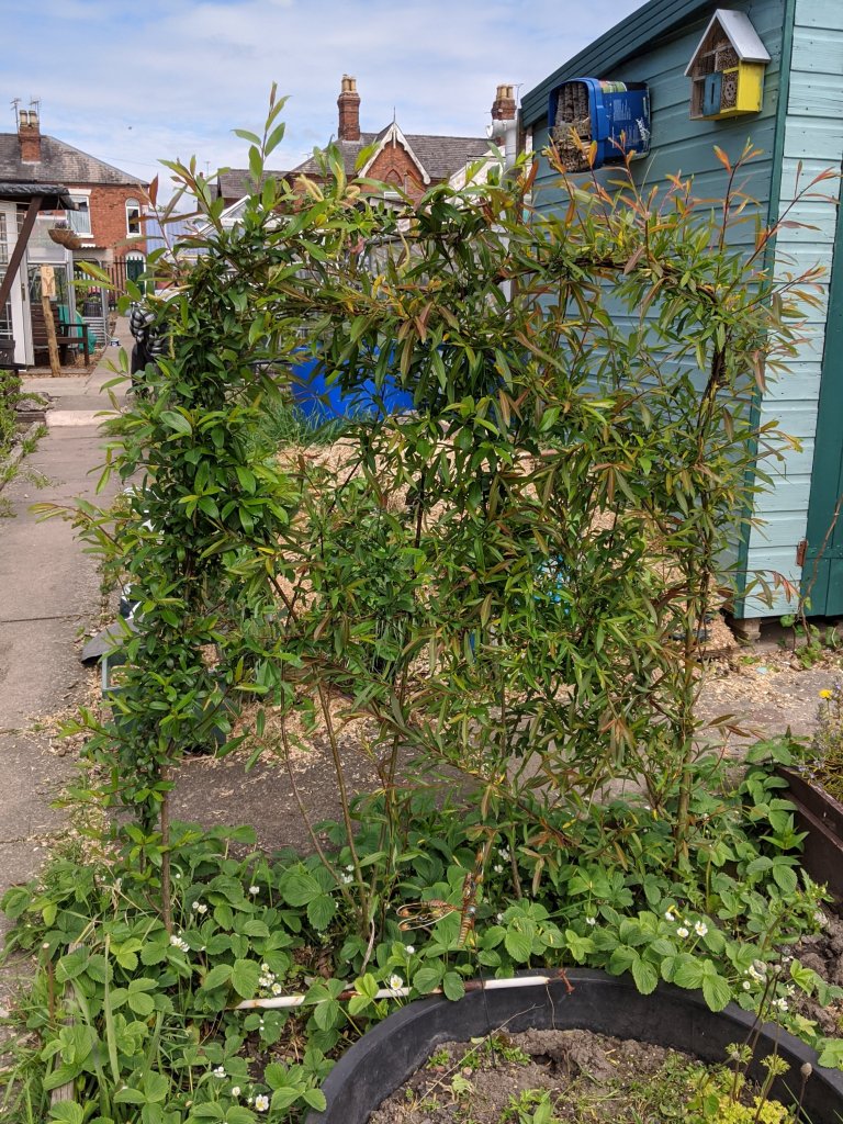 As we were leaving I spotted that the willow has been growing enough to train some of the new branches. The screen is filling out well and the arch over the bench is starting to look more full. I am hoping the arch will finally join at the top this year. It only needs to grow another 2 inches to touch and possibly another 5 inches to properly weave it together. All that’s left to do is to weed the crazy paving and sit on the bench and enjoy the sunshine.