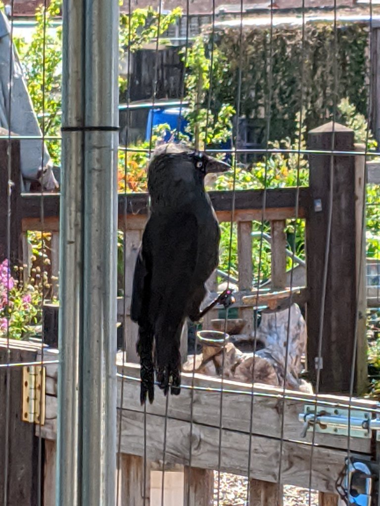 Between us, we fed and watered the chicks, the old girls in the main coop and Leia and Rey in theirs. As I popped back into the main coop to see whether Pop and Polly had finished laying, I spotted an interloper. A wild bird, crow family judging by the colour, was hopping around the coop. I wasn’t sure why it was there but upon closer inspection it appeared to have an injured left wing. Suddenly, the chickens spotted the bird and launched a full on attack. The poor bird desperately tried to get away from Pop and Hattie who were going at it hell for leather. Eventually, it escaped long enough to jump up onto the wiring and climb up out of range. It then spent several minutes working out how to escape through the bars. Once out, it ambled around the Community Garden before disappearing off somewhere.
