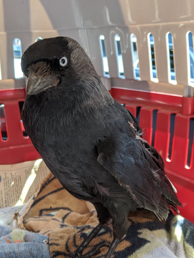 Finally we arrived and met the person I had spoken to on the phone. She took the bird inside and had a look at its wing and leg. She reappeared a few minutes later, holding the bird in one hand. What was hilarious was it was now wearing a kitchen roll tube on its head. This was to ensure no one else got half eaten. A brilliant idea if you think about it. Also, so is wearing thick gloves when you catch an irate injured bird but hindsight is a wonderful thing. Ho hum. She said that he had previously broken his wing but that it had fused back together incorrectly. Upon discovering he was a Jackdaw we christened him Jack and waved him goodbye. The charity will care for and try to help him over the next week. I can email for an update next Wednesday. As we drove home, we left a donation to cover the costs of keeping Jack. It’s so good to know there are places still up and running who can care for injured wildlife.