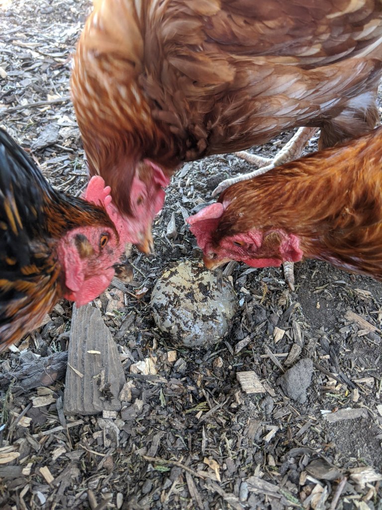 I had brought down the frozen chicken treats for our girls to try. I realised I had made far too many so I handed out some to Phil, Geoff and Cliff for their girls. Hopefully their chickens enjoy them! Our chicks seemed rather clueless about the treats so we left them to work it out. In the main coop, it was a different story. The girls immediately went for the ice disks, shoving each other out of the way in order to get at it. Even spacing out four treats, they still argued!
