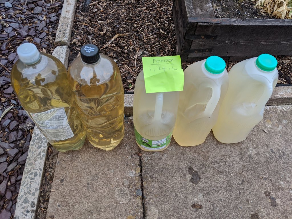 We went to Phil’s shed and picked up three supers (without frames) and three white feeding boxes. Phil had made up a massive batch of sugar syrup and dropped it off earlier in the day. Hives 1, 4 and 6 were swarms and in view of the sudden change in the weather, the colonies run the risk of starving. We removed the top of the hive and placed the new super on top of the crown board. The feeder only goes in only one way into the super which makes life easier. The super was filled with 2 pints of sugar syrup before we closed up the hive. We will check on how much syrup is left after a few days.
