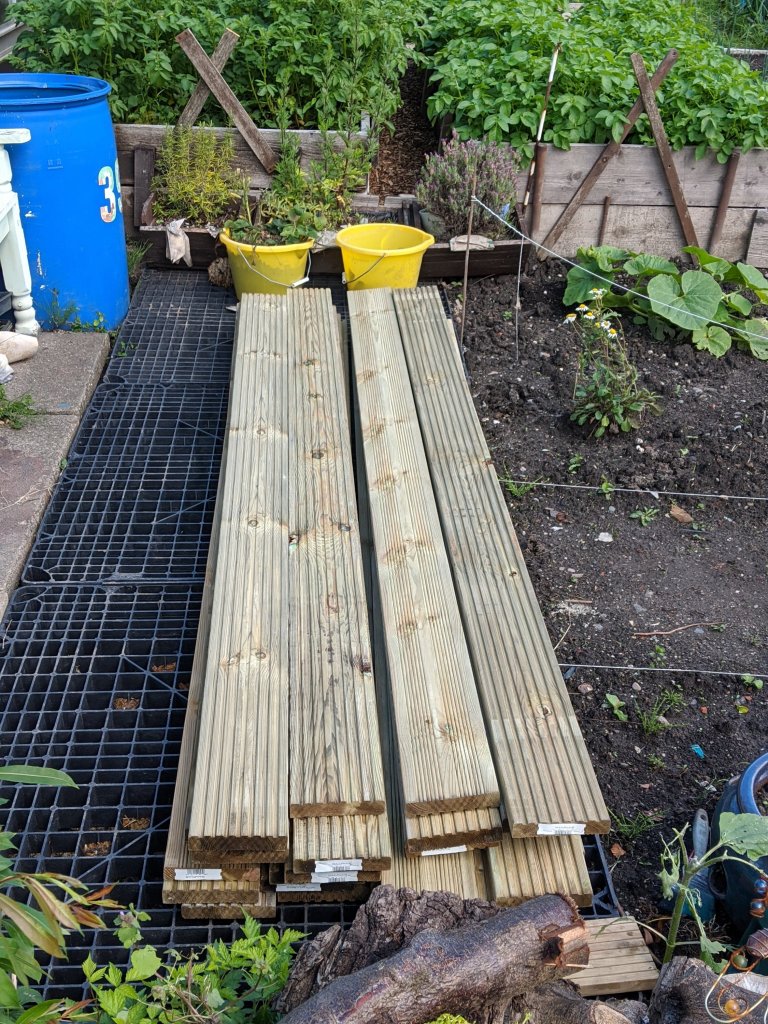Whilst I was busy with the bog garden and ponds, my husband had been lugging huge amounts of decking board from the car to the veranda. The weather forecast isn’t brilliant for tomorrow and our plot is so sodden that we won’t be able to sort out the boards until it dries.