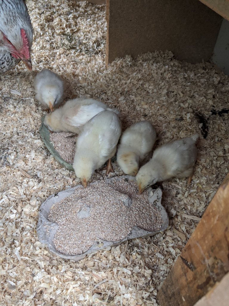 In the broody coop, Leia was inside with her chicks. I took the opportunity to clean out the water bowl in the run before she appeared to inspect what I was doing. She was followed by all five chicks who are clearly much more confident in being outside now. As they walked around, I sorted out the mess in the nest box. For reasons best known to Leia, she has to throw all the sawdust around the nest box, piling it up over the food and water. When I opened the door today, almost all the bedding was against the door. Using a stick, I spread it back out and excavated both food bowls and the water feeder. Even with the feeder raised on a brick, Leia had managed to bury it. As soon as the new food was out, in they all came! They have grown in size as well as feathering up rapidly. Hopefully they will continue to grow quickly so I don’t have to keep worrying about them escaping from the coop!