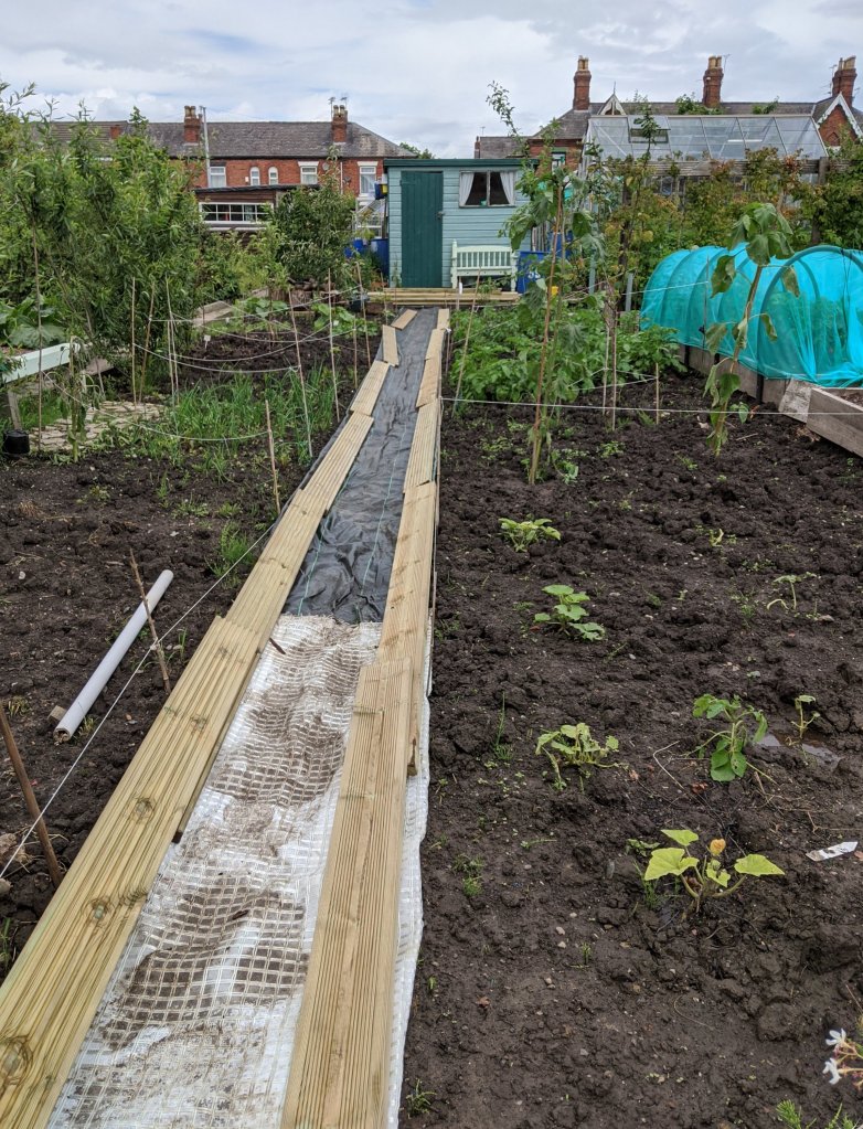So tomorrow, I will finish putting in the boards along the path. Ideally, the weather will be dry enough that I can start to build the beds with the other boards. In order to limit the flooding, we will need to source a lot of bark to not only fill the path up but also to finish off the fruit section at the back of the plot.
