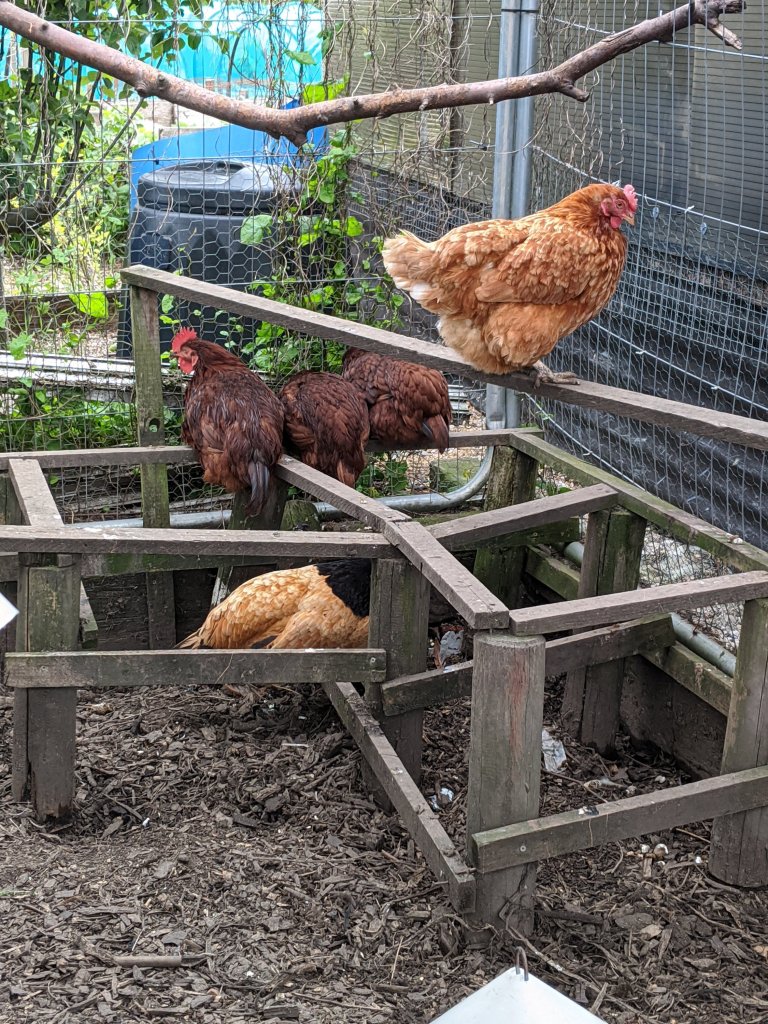 I spent a while in with the chickens. Geoff who is a chicken whisperer and has his own lap chicken (I kid you not!), taming his by sitting in the coop with them for half an hour or more a day. My hand feeding of the girls continues well and I even had Rey and Molly interested today although they didn’t get much of a look in thanks to Millie, Hattie, Snap and Polly. I collected three eggs which is an improvement on the last week and is linked to the improved weather. Despite being warm and humid, most of the day was overcast.
