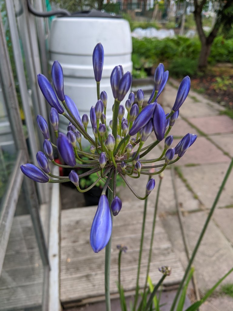 As we were talking, Steve appeared holding a scone tipped with strawberry jam and clotted cream. It turned out that Tracy had made scones and brought them down to share with everyone. The strawberry jam was delicious, made from Mick the Greek’s strawberries whilst Steve organised getting the cream. There is something special about eating home made baking that has ingredients grown in the allotment. There is no taste like it. Two rounds of scones and a chilled hour chatting with Tracy, Andy and Steve, I began to close up the shed. Just as I was getting my stuff together, Tracy shouted at me to come and see the loofa plants. It has been a couple of weeks since I saw them and I was amazed at how big they are now! Tracy has done so well to get seven plants from nine seeds. She showed me how she has set up for her loofa plant, utilising a grow back on end in a bucket with bark chipping at the base, all sitting on a pot tray with water in. Apparently, loofa plants like humidity and Tracy has been keeping the greenhouse door closed to ensure a consistent temperature and humidity.