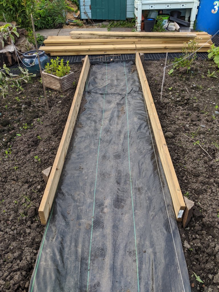 The guy we were going to see had listed them for free! He had four enormous trunks at the front of the house. One was a perfect size and between him and my husband, they got it into the car. The suspension had to work quite hard on the drive back to the allotment! When we arrived, I got the trolley and we positioned the trunk on it and lugged it down to our plot. Grabbing the spade, I dug a hole and we rolled the trunk into place before squashing down the soil around it to ensure it stays in place.