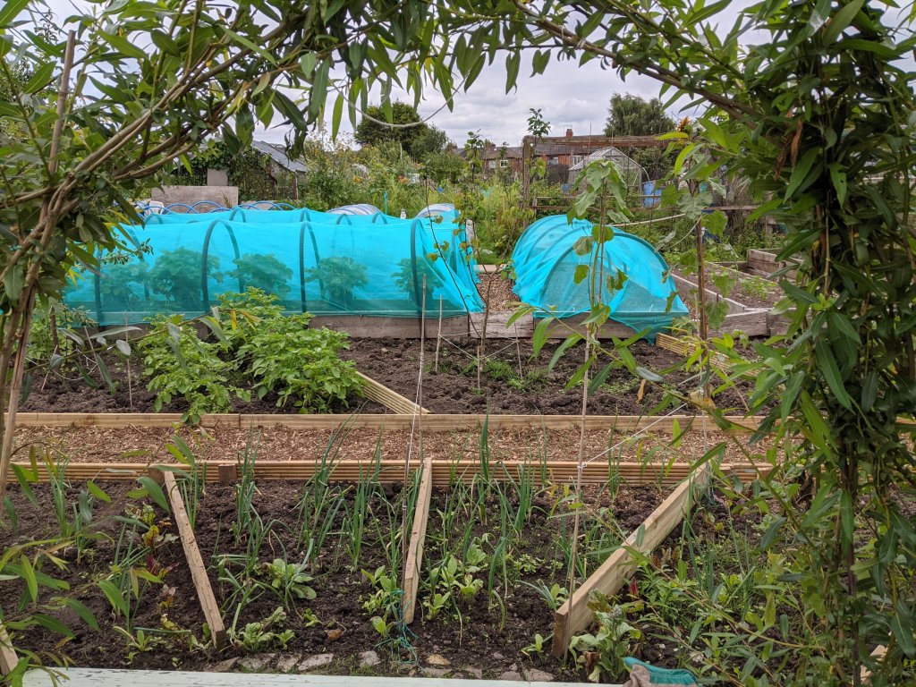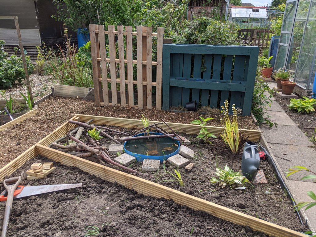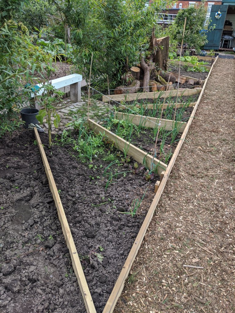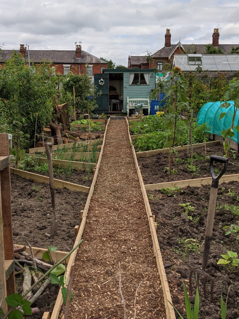 Today I ambled down to the allotment determined to finish off the path and beds. Rain was forecast for this afternoon so it was a race against time to get it completed. Liz swung by before I started work to have a look at the new layout. She was staggering underneath an enormous pile of harvested crops. Very kindly, she gave us two aubergine plants – these will need to go in the greenhouse tomorrow. I started off cutting the boards for the sections down to size. It took quite a while to get them all done, a mini trench dug and the board put into place. Once the boards were in place, I was able to remove the string and stick markers to see how the new layout looked.