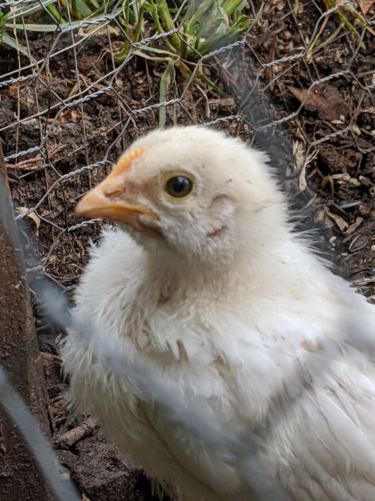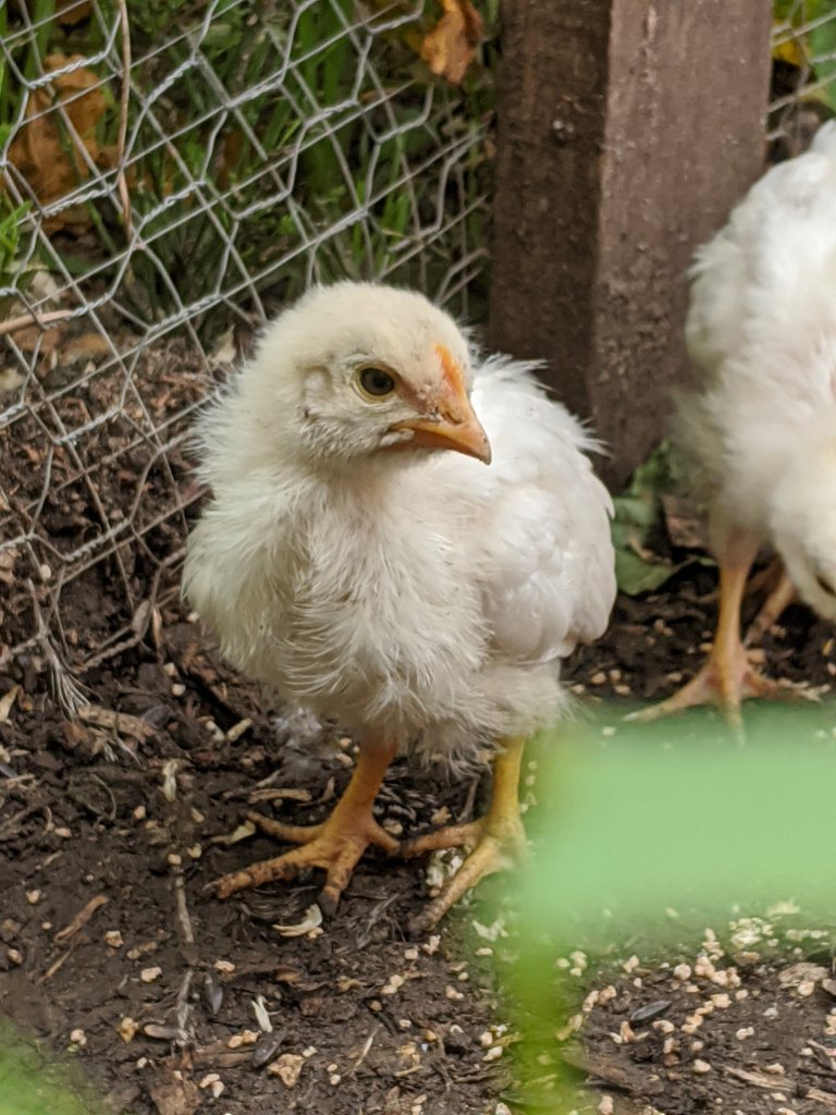 Leia and her chicks are still busy enjoying exploring. When I arrived Leia had taken her chicks outside, leaving me in peace to change the water and top up the food without fear of being eaten alive! She has definitely started to chill out again and I even managed to hand feed her today. The combs on the chicks are growing quickly as well as their feathers. Steve and Phil’s leghorns have large combs even on the hens so it will be interesting to see when we can confidently determine which sex the chicks are. As yet, none of them are standing proud on their legs but it’s extremely unlikely that all five chicks will be pullets.