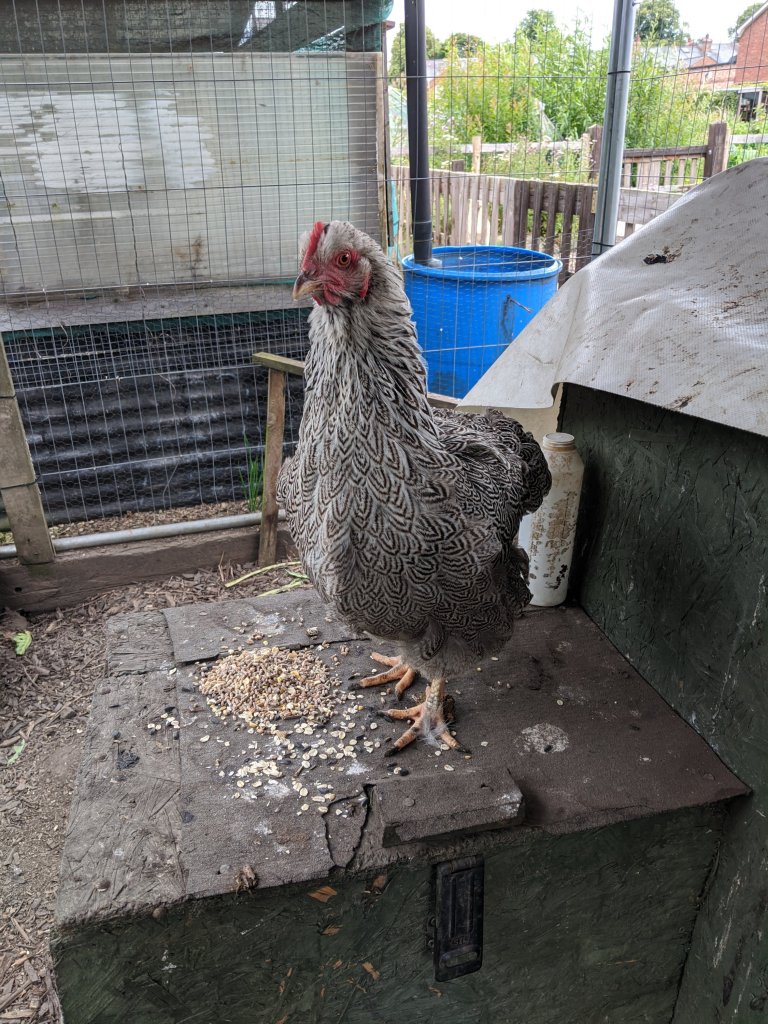 After waiting in for a special delivery most of the morning (which was damaged in transit and didn’t arrive), I got down to the allotment quite late. When I got down, I was quite worried about Pop being in the greenhouse in the sudden, unexpected heat. Fortunately, Geoff had opened both greenhouse doors and brought her out of the nest box. I felt her crop and found she didn’t have much food in it. On the one hand this is good because it shows her crop is working and emptying properly. On the other hand, it means she hadn’t eaten much in the morning. I walked down to the main coop and grabbed some corn, oats and sunflower seeds and took Pop’s food bowl back to her. She had a half hearted rummage through it then had a doze.