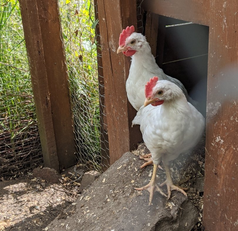 Suddenly, I remembered that Leia would be on her own in the broody coop. I carefully put Pop back into the now much cooler greenhouse and ran down to check on Leia. Poor Leia, she looked rather lonely and a bit at a loss without her chicks. I decided it was time to bite the bullet and put her into the main coop. Prior to going broody, we had tried to integrate her with the rest of the flock. It didn’t go well. Chicken wrestling isn’t a sport but it should be because trying to catch a recalcitrant bird is hard work, requiring speed, agility and strength worthy of any number of different sports. She shouted the place down, disturbing Geoff who was enjoying a quiet pipe with his chickens. To help Leia, I put her on the top of the nest box with some food, so she was initially out of range of the others. They all eyed each other suspiciously. Aggie was rather curious and jumped up to see who this was. Leia freaked out and tried to hide. It was rather pathetic. Aggie was completely bewildered at Leia’s reaction. I left them to it for a few minutes and walked across to Geoff’s coop to say hello.