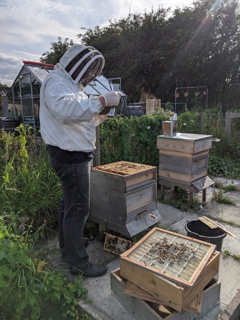 At half four, I had a message from Steve saying he and Phil would be on site for five o’clock. I grabbed my bee kit and headed down a few minutes early. I put Pop into the nest box and changed her water. She is still eating well and I think she is coping well with Leia especially when Leia walks over Pop. When Steve arrived, I closed up their coop and got suited up.
