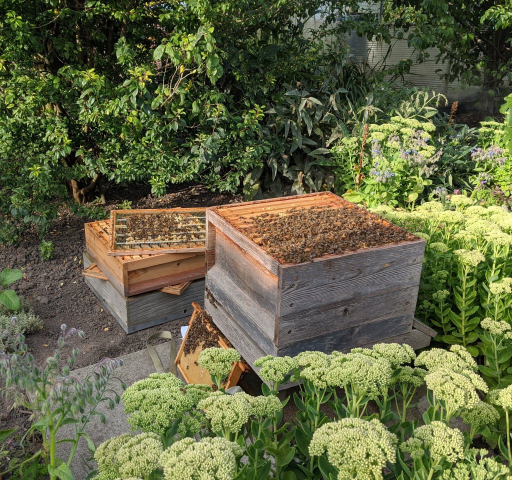 Halfway through lunch, I had a message saying that a friend could drop off a few small logs to fill the remaining space in the stumpery. I dashed down to the allotment and we carried the logs to the plot. Matt was accompanied by his daughter and she asked to see the chickens. We walked around some of the chicken coops so she could see lots of them before they headed off. I legged it back home and finished lunch waiting to hear when the bee check would be.
