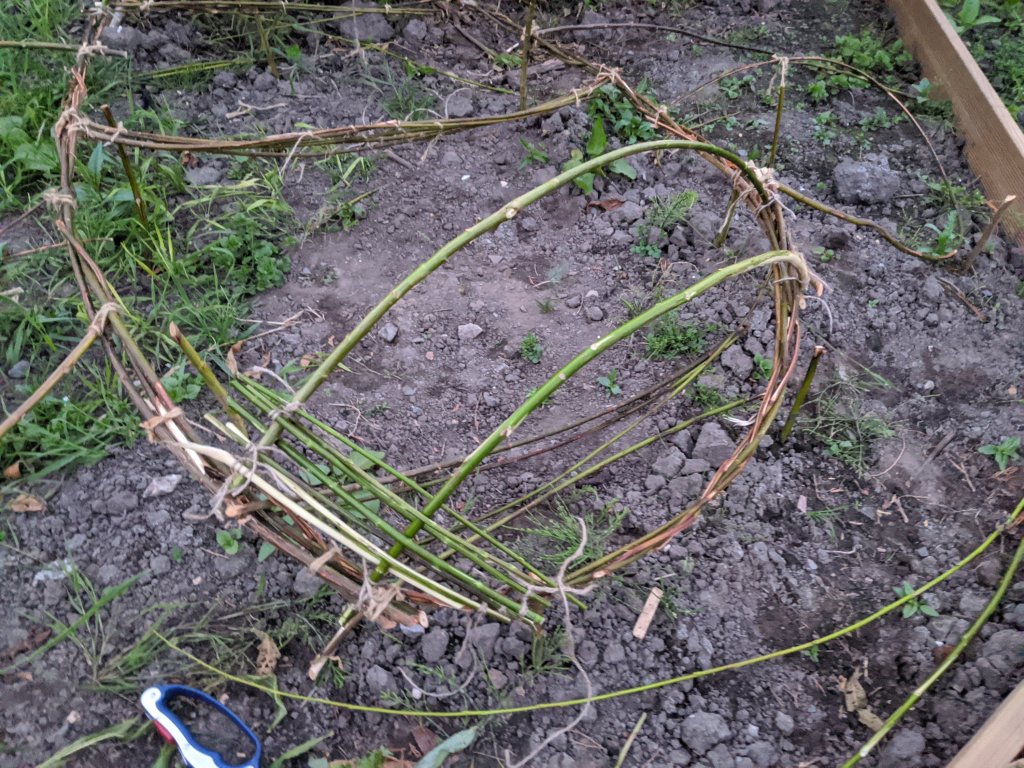 Next I ambled across to Rachael’s plot and collected some willow cuttings to build the next part of the willow bee. I had managed to think of a way to make the bee 3D. Using several strips of willow stretched into an arch shape and attached to the frame of the bee then weave shorter willow strips to build out the top of the bee stripes. All very well in theory and I made a start on the head of the bee. Three arches secured into place and I began to weave the shorter willow strips into place. The heat was intense and the lack of shade made it worse. It didn’t get too far before I conceded defeat. I decided I would pop back this evening when it was cooler.