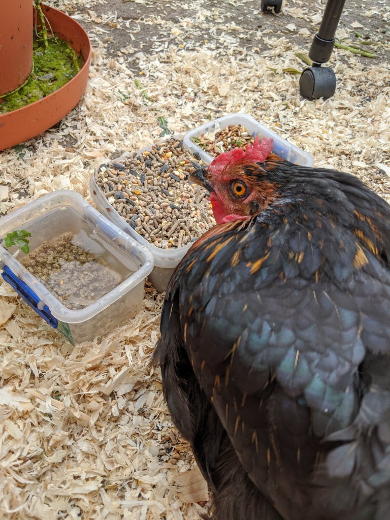 Back in the greenhouse, I put Pop into her wheelchair, got her legs and feet into the correct position and tried to distract her with fresh green kale. Leia was busy throwing around the shavings in the nest box before deciding that it wasn’t good enough to lay her egg. Rolling my eyes at the princess chicken, I opened up the top tier of the nest box. This has a thick layer of fresh bedding and a dark corner to lay in. She jumped up and enthusiastically rearranged the bedding to her liking and got busy laying her egg.