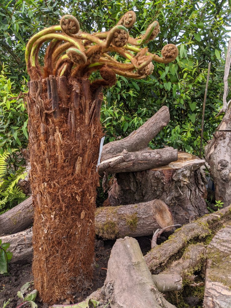 Next, I walked up the main path to check on the tree fern. It arrived a few days ago and my husband helped me plant it yesterday evening. It is the finishing touch to the stumpery and it looks amazing. Between the ferns and stumps there were a few weeds growing so I made a start on clearing them.