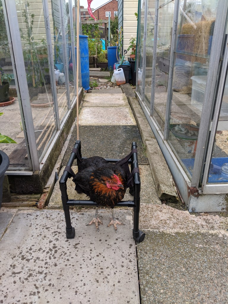 I put Leia in the outside run and put Pop into her wheelchair. Recently, she has been getting herself out of it quicker and quicker. With the success of standing, I decided to try pushing the wheelchair to see if she would walk a step or two. I moved the wheelchair onto the flat between our greenhouse and Mick the Greek’s. Holding onto the top of the wheelchair, I pulled it slowly towards me. To my astonishment, Pop immediately picked up a foot and placed it forward correctly. I kept moving backwards, pulling the wheelchair towards me, Pop kept taking a few steps at a time. A couple of times, she couldn’t bring her leg forward or didn’t put her feet flat so I stopped and sorted out her legs and feet before restarting. In the end, she had walked the whole length of the greenhouse. Considering the last time she walked any distance was over two months ago, it’s amazing!