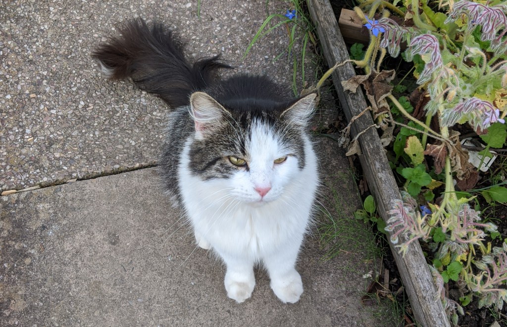 Pondering what to do next, I spotted a white furry face peering at me through the foliage on Phil’s plot. Trying not to startle the cat, I managed to kneel down and coax it out. It’s stunning and has absolutely enormous paws. Despite not having a collar, it clearly is domesticated. As with all cats, it loved being scratched behind the ears and on the top of the head. I decided to call him Bertram as there was something about him that reminded me of Bertie Wooster of P. G Wodehouse fame.
