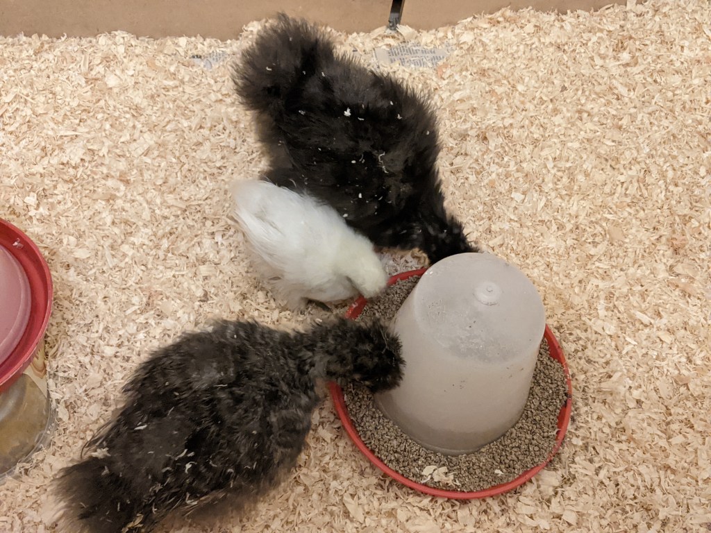 What followed was several minutes where sawdust flew everywhere. Hilarious though this was, none of them had shown any interest in the food or water bowl which worried me. I tried hand feeding them but they ran away. Eventually, the dark blue chick ambled across to the food bowl and gave a cautious peck. The other two chicks instantly joined her and for a couple of minutes all you could hear was the sound of pecking and happy hungry cheeps.
