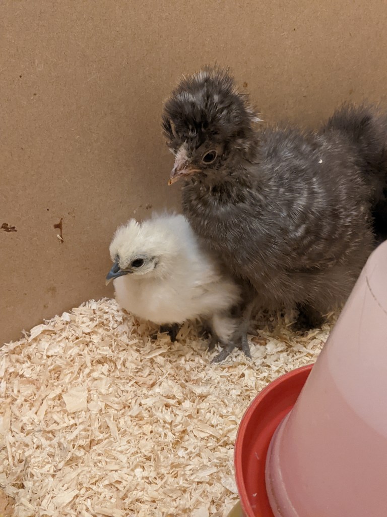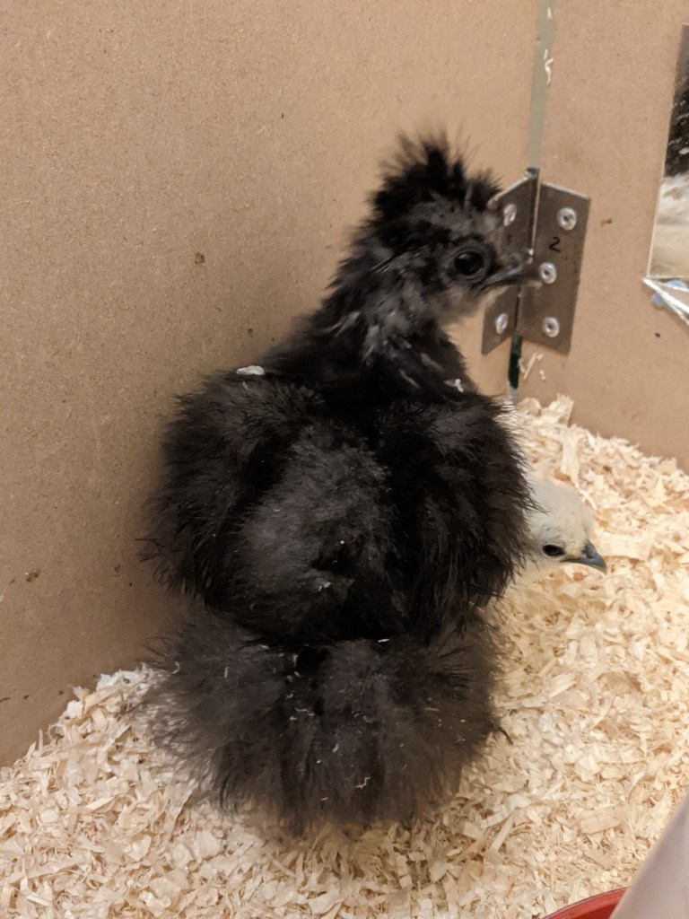 After a minor confusion over which farm had the silkies, we were met by a cheerful farmer who showed us his breeding set up. He had a large heated shed which housed several small coops and an enormous incubator. We had a peak inside the incubator and, to our great excitement, saw two newly hatched chicks! He showed us the different chicks, ranging in age from a few days to several weeks. He had half a dozen five week old DNA sexed chicks. There were two dark blue, one cuckoo and two mini white silkies. I quickly chose a gorgeous dark blue, a mini white and the cuckoo. Transferring them gently into the pet carrier, all you could hear was loud cheeping. The mini white was half the size of the other two. I was quite worried when the other two chicks kept walking over it or pushing it out of the way. Maybe three chicks wasn’t a good idea?