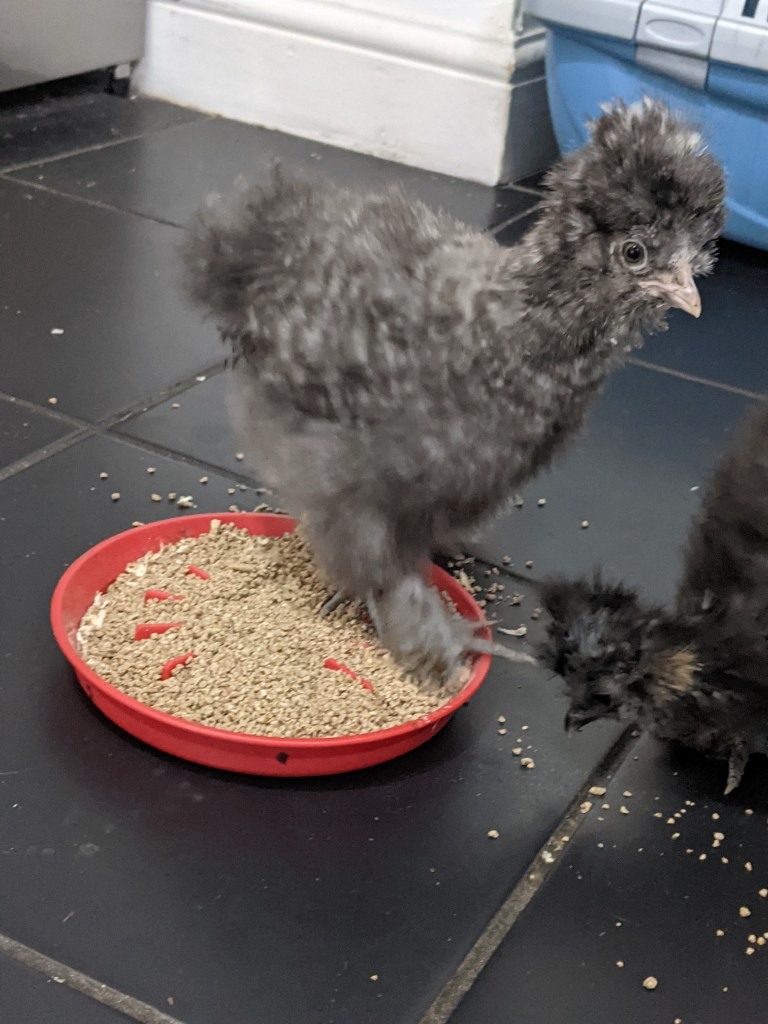 But their lack of names has been concerning me. Before I cleaned out their run this morning, I took them into the kitchen and let them have an explore. They didn’t venture far from the door, tentatively pecking at the food bowl a foot from where I was sitting. I watched them for a while and tried to think of different names without success.
