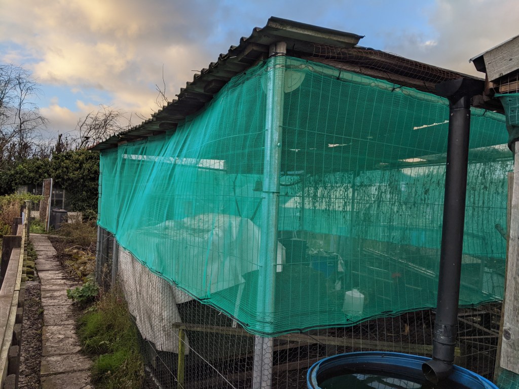 With the rapidly impending DEFRA deadline for ensuring every coop is secured against wild birds, we dashed down to the allotment armed with a 50m roll of scoffolding netting and a bag of cable ties. Unfortunately, there have been a a number of bird flu cases in Cheshire and across the UK over the past few weeks. If a bird has signs of bird flu, it must be culled as would any birds within the vicinity. On our site, only one chicken being infected would mean every chicken on site would have to be culled.