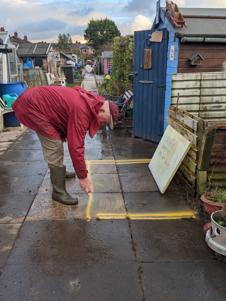 As we were leaving, we spotted Cliff busy with a tin of spray paint. Curious, we came closer to find Cliff busy making a parking place for Geoff’s new scooter. He has also made a sign for the parking space with Geoff’s name on it. We’ll see whether Geoff enjoys his new space tomorrow!