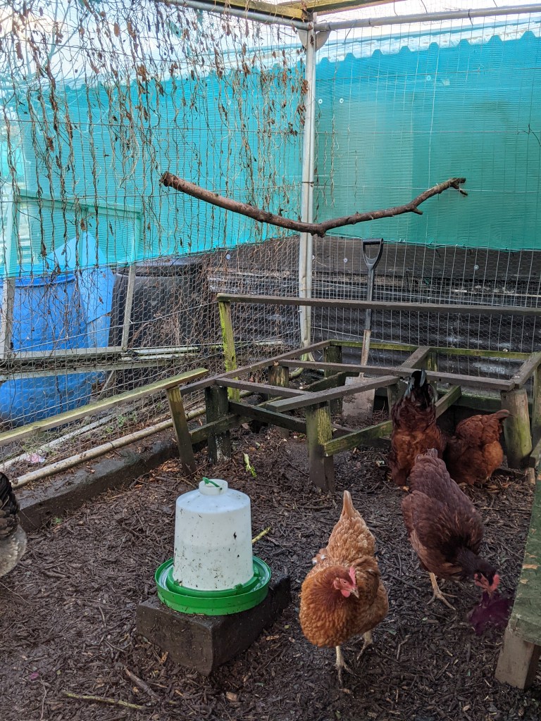 Leaving the coop, I walked up to the greenhouse and pondered the best way to clean out the warring chickens. A couple of days ago, I let Sadie out with Leia and Lilja. It didn’t go well. But I couldn’t think of a way of keeping them separate whilst I cleaned as the run fills up half of the greenhouse floor. Biting the bullet, I removed the run and let the girls mix. Initially, it didn’t go well and my attempts to clean were hampered by various chickens flying through the air at each other. Slowly though, they began to settle a bit and I managed to take out all the old bedding.