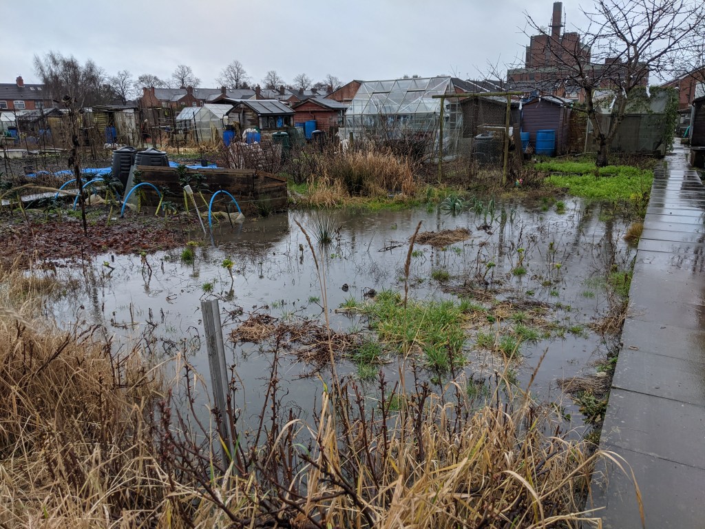 Day two of Storm Christof and the entire allotment site is under several inches of water. There are several plots severely flooded and inevitably, ours is one of them! The last few wet weeks combined with an already high water table has meant the current downpours has flooded vast swathes of the allotment site I have never seen underwater before.