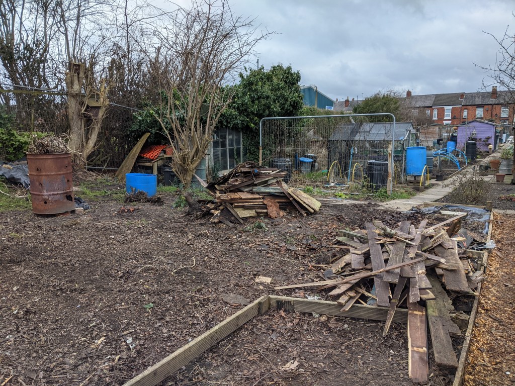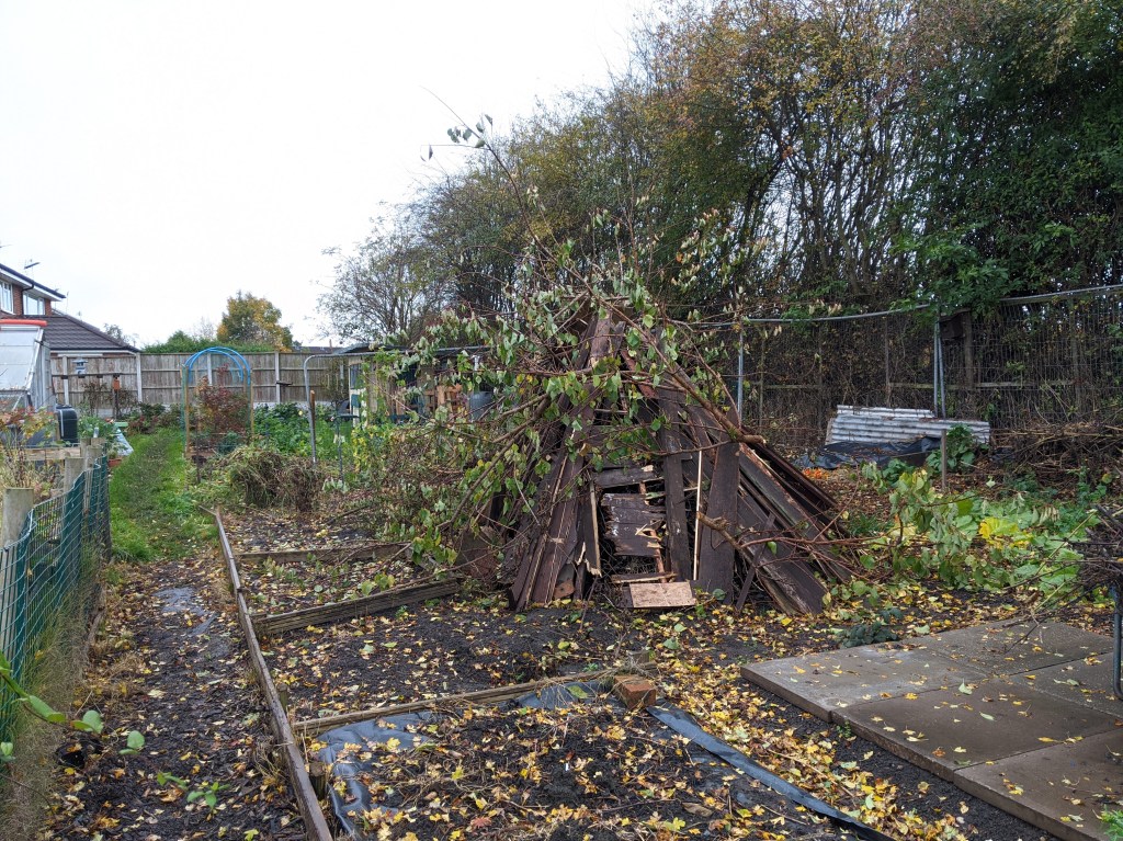 So early this morning, I ran down to the allotment to help our friends Liz and Sarah clear the enormous pile of wood from the unsuccessful bonfire night mountain. The half plot has been covered by this stuff for months with no concrete plan to move it. Luckily, one of our friends owns his own gardening business and was happy for us to borrow his wood chipper for the day. Whilst he helped get it into place, I took his four year old daughter around the site to visit all the chickens. We ran into Phil who kindly let us go into his coop to feed some treats to the chickens and collect some eggs. Chickens suitably counted, I dropped her back with her dad and we made a start on the bonfire mountain.