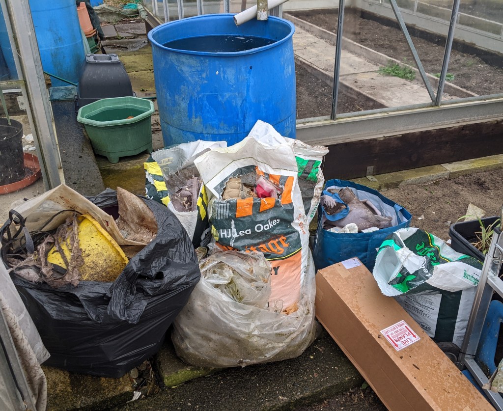 In the shifting of the shelves, I spotted something scurrying away. Several small brown mice had made a dash for cover. I cleared away all the old bedding in odd corners which were hard to get at without shifting everything. Next, I tackled the various bits of junk and bagged them up. For good measure, I walked up and down the plot to ensure I hadn’t missed anything. We bundled everything into the car and my husband dashed off to try and get to the tip before it closed.