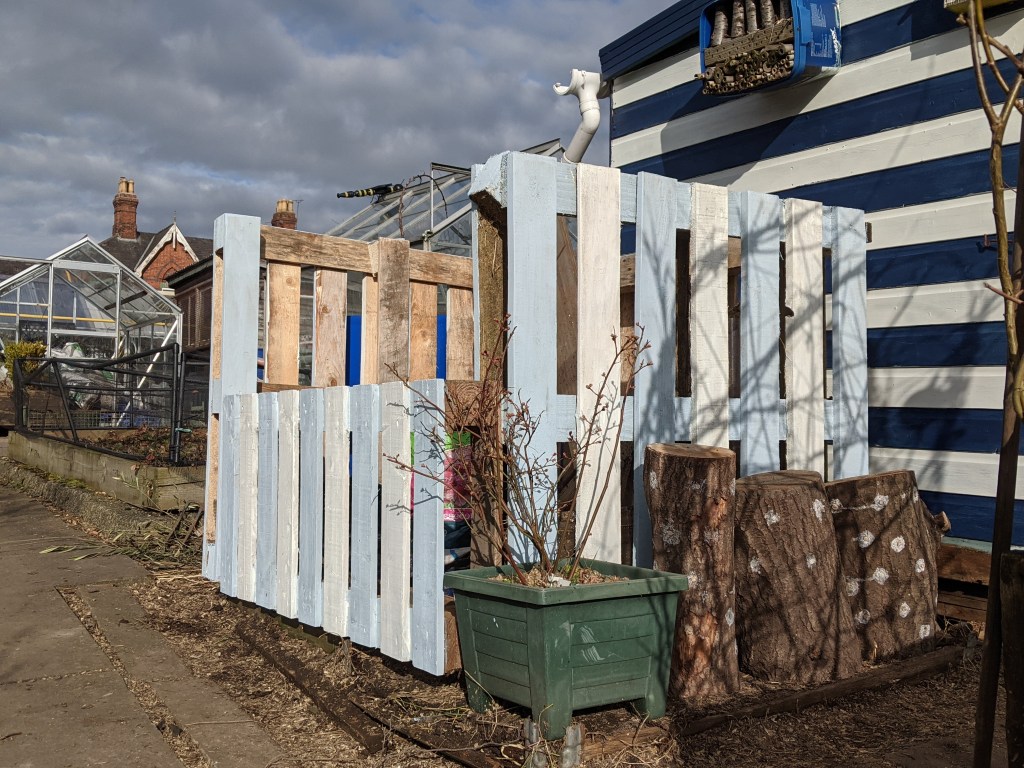 Once everyone else had left, I made a start on painting the compost frame. I wanted a paler colour so that the shed still stands out and opted for white and pale blue in vertical stripes. The rough pallet wood soaked up the paint almost instantly and I decided not to bother with a second coat. Leaving it to dry, I wondered about starting on the last coat of the navy paint on the shed but thought better of it. Instead, I used the handle I had borrowed from Sarah and used the hoe to level out and weed the first five beds. It looked much better for it!